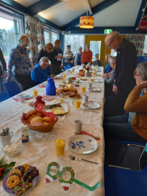 Dit keer zochten de wandelaars onderweg naar kleine ‘kijkkastjes’ met daarin een muziekwerkje, een afbeelding of vraag. Verrijkt met de nodige kerstweetjes schoof iedereen na de wandeltocht aan voor een heerlijke kerstbrunch. De tafels waren feestelijk gedekt en er waren meer dan genoeg lekkernijen. Wat fijn dat er zo’n grote opkomst was en wat heerlijk dat we met elkaar zo’n fantastisch gezellige groep hebben. Op naar het volgende jaar!